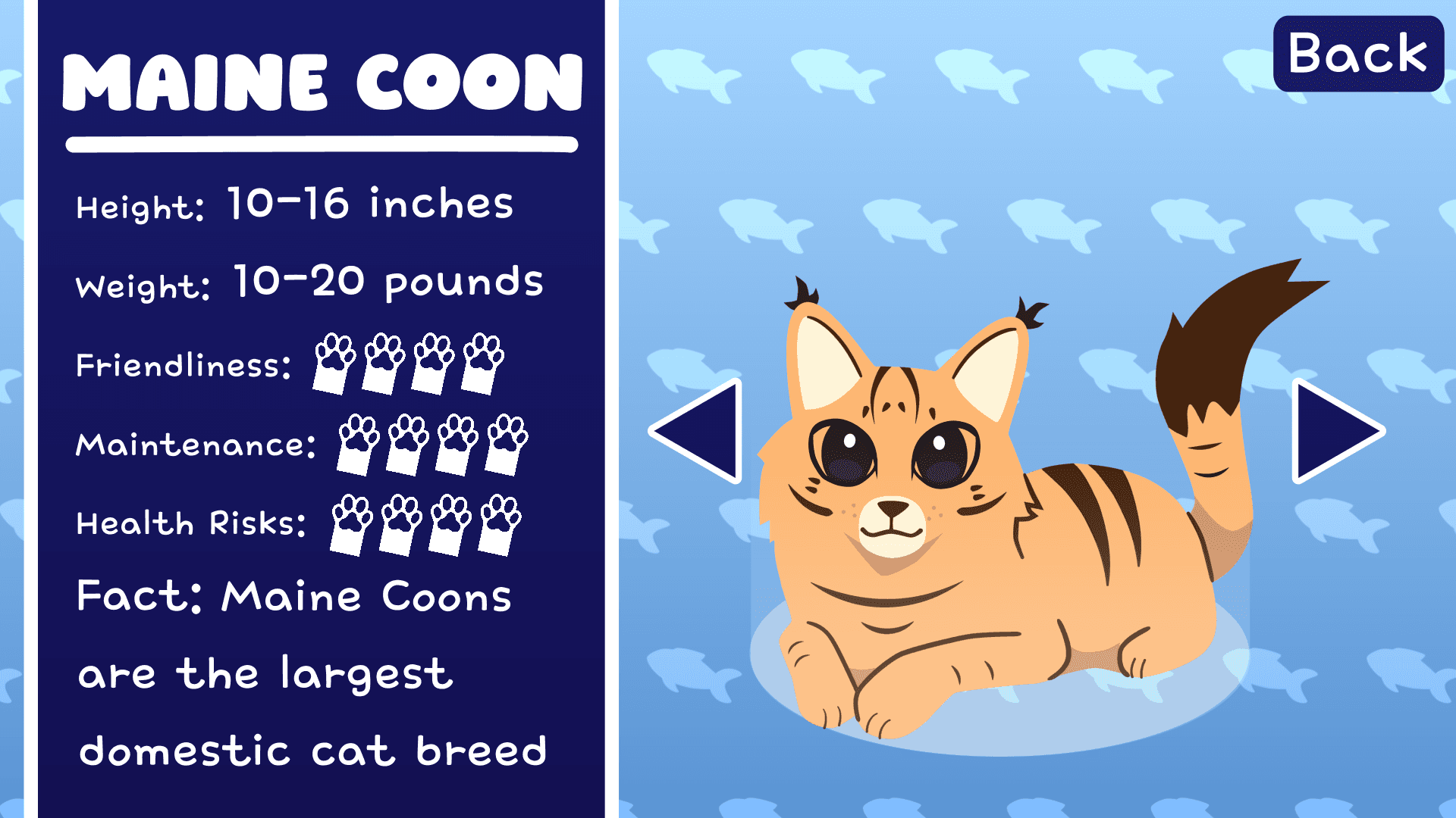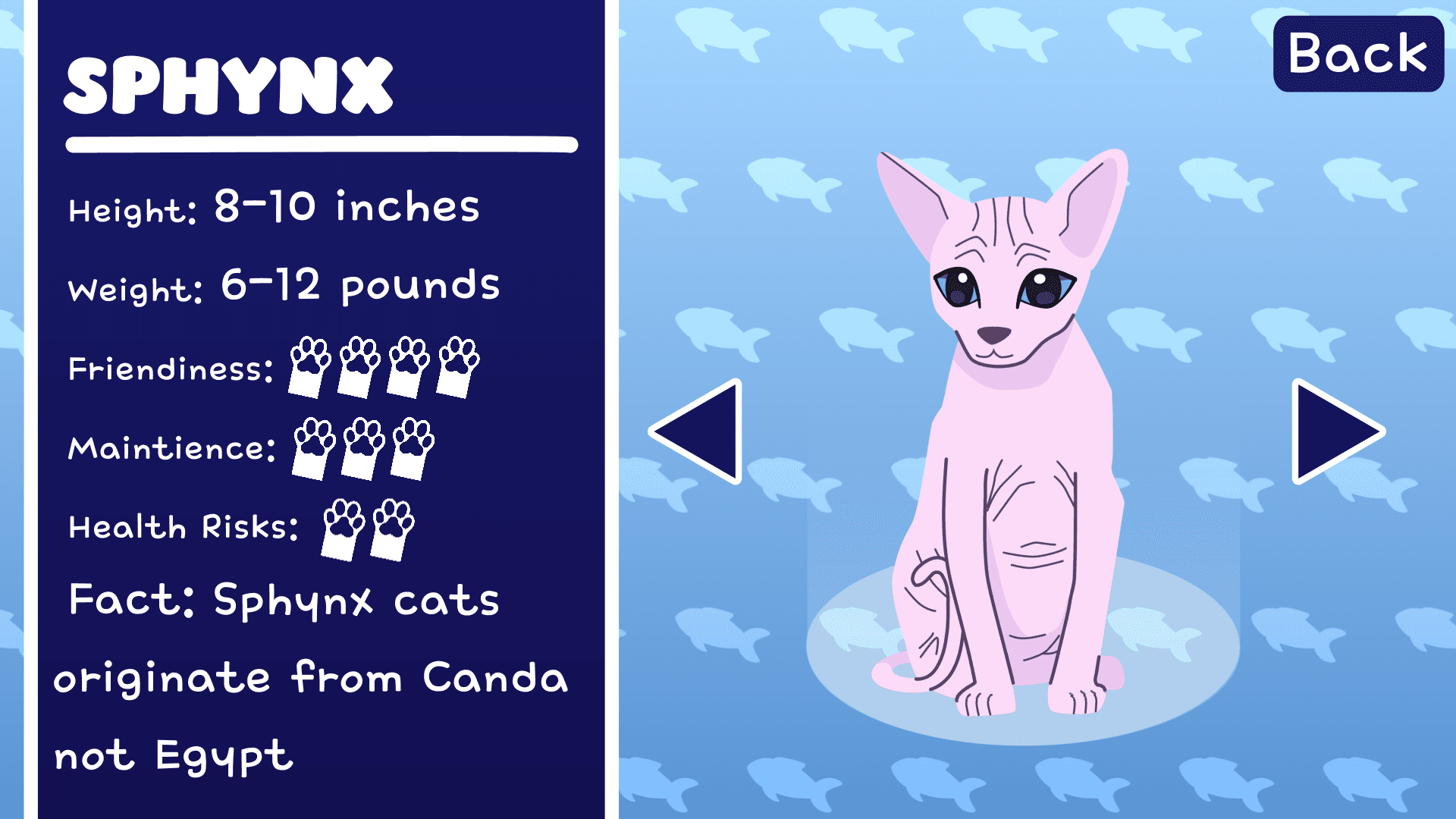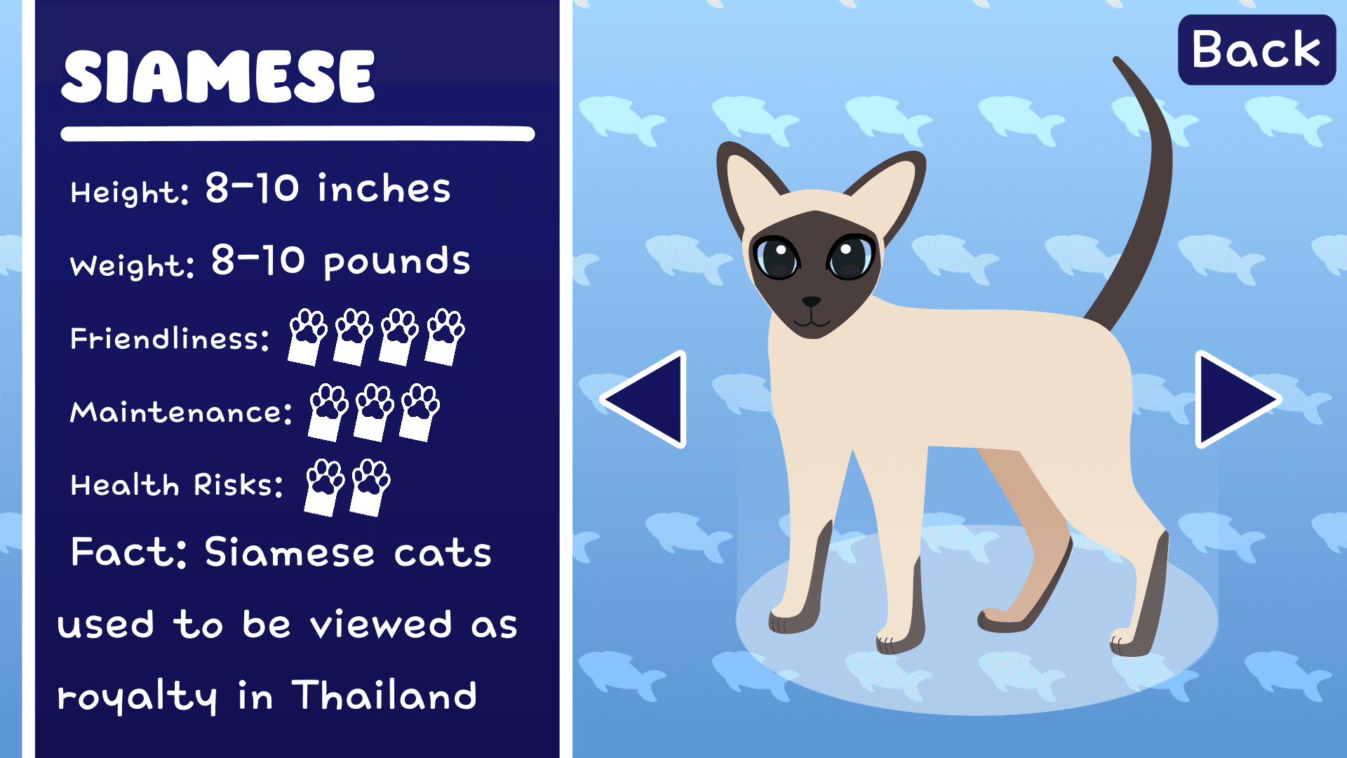 A informational video about cat breeds, based on video game graphics. I decided to include my three favorite cat breeds. I felt a character select screen would be a fun way to convey information of each breed. To keep a cutesy vibe, the designs were kept simple and round. The cats were drawn in Illustrator then animated in After Effects. The UI elements were designed and animated in after effects.
